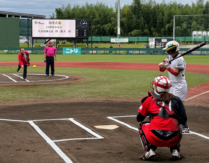 贈呈式と始球式には、JA群馬中央会の林康夫会長が出席し、「群馬県産の農畜産物を選んでいただき、群馬の農業を応援してほしい」と来場者に呼びかけました🙌