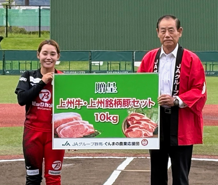10月19日、JAグループ群馬は、群馬県高崎市の宇津木スタジアムで開催された「ニトリJDリーグ2025第13節」高崎開催試合に協賛し、市内に本拠地を置く女子ソフトボールチーム「ビックカメラ高崎」と「太陽誘電」の両チームへ、県産の「上州牛」「上州麦豚」セット(計10kg)を贈呈しました🐄🐖